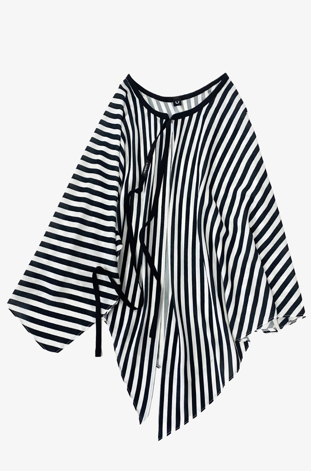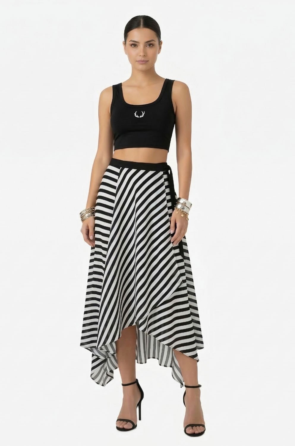 • Nadčasový vzor: Výrazné čiernobiele vertikálne a diagonálne pruhy opticky predlžujú postavu a dodávajú outfitu grafický, moderný ráz.